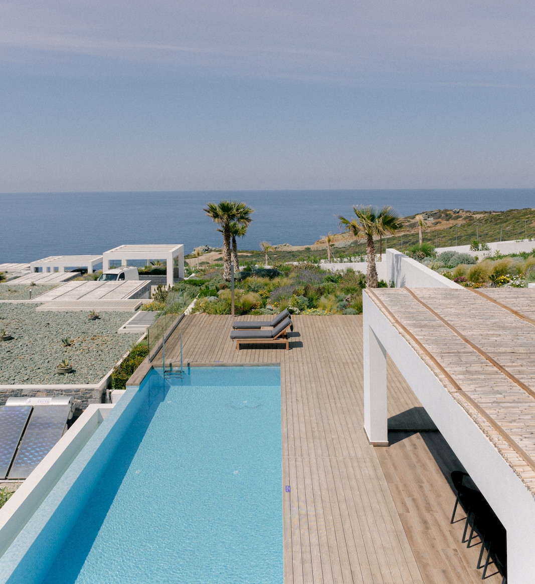Rock Bay Villas is a private complex of four villas with panoramic sea views. Located on the cliffs of Crete, the villas offer privacy, comfort and a calm setting with direct access to a private bay. Each villa includes spacious terraces, a shaded pergola with a kitchen and grill, dining areas and a fresh-water pool.